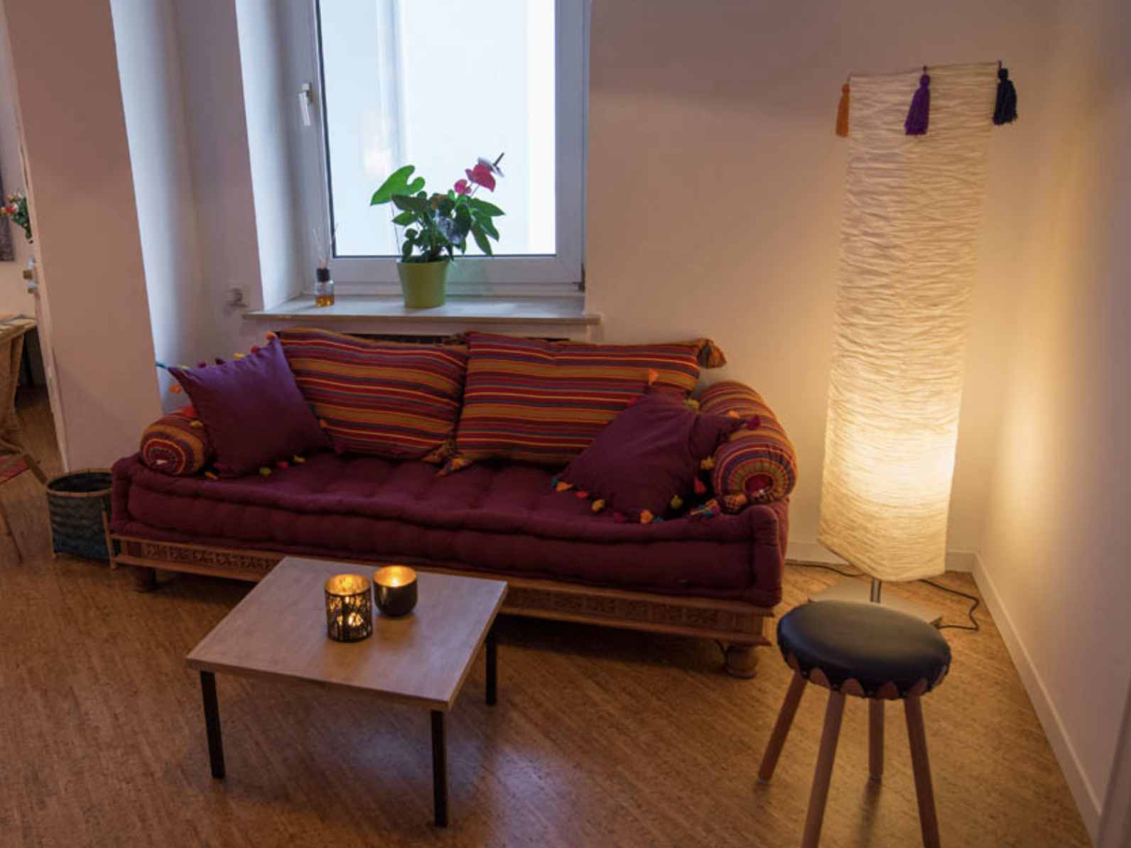 Ausstattungsmerkmale: Der 36qm große Gruppenraum verfügt, ebenso wie Umkleide- und Aufenthaltsbereich, über einen angenehm fußwarmen, fest verklebten Naturkorkboden. Die Gestaltung ist schlicht und auf das wesentliche fokussiert. Eine durchdachte Raumakustik schafft gute Vorraussetzungen für entspannten und achtsamen Austausch ebenso wie für den lebendigen Tanz dank hallreduzierender Maßnahmen und guter Soundanlage. Je nach Art der Veranstaltung eignet sich der Raum für Gruppengrößen bis zu etwa 16 Teilnehmer*innen.