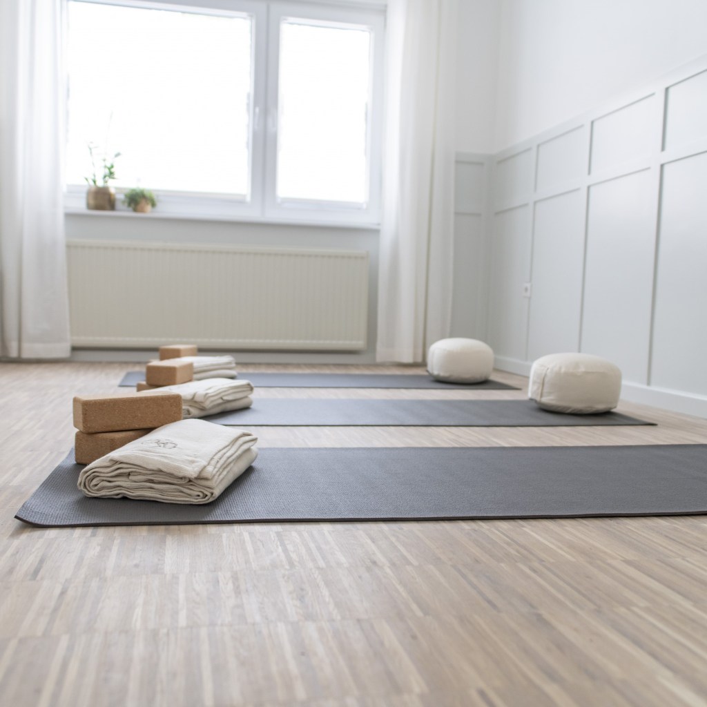 Raum 2: 18 qm Platz für Yogaunterricht – für Kleingruppen (max. 5 Teilnehmer), Einzel- oder Paar-Yoga Training. Er eignet sich auch für Meditationsseminare, Massageangebote oder Dein ganz persönliches Angebot. Alles was Du für die Praxis brauchst, ist bereits enthalten und ohne Aufschlag nutzbar: