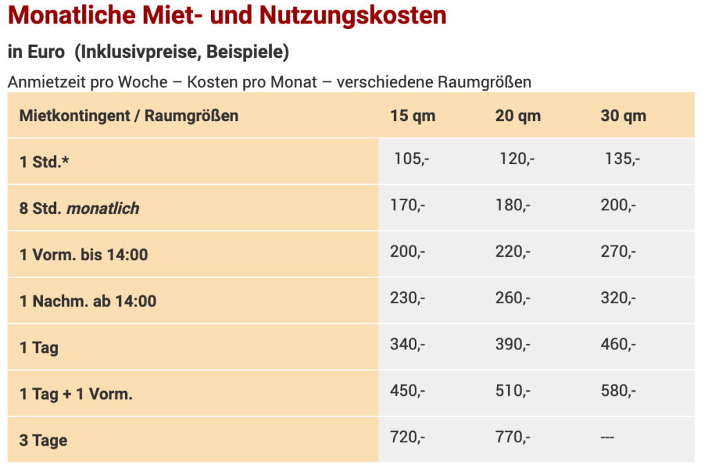 Die Gemeinschaftsräume sind komplett eingerichtet; ihre Nutzung ist im Mietpreis eingeschlossen. Seminarräume können auf Anfrage angemietet werden.